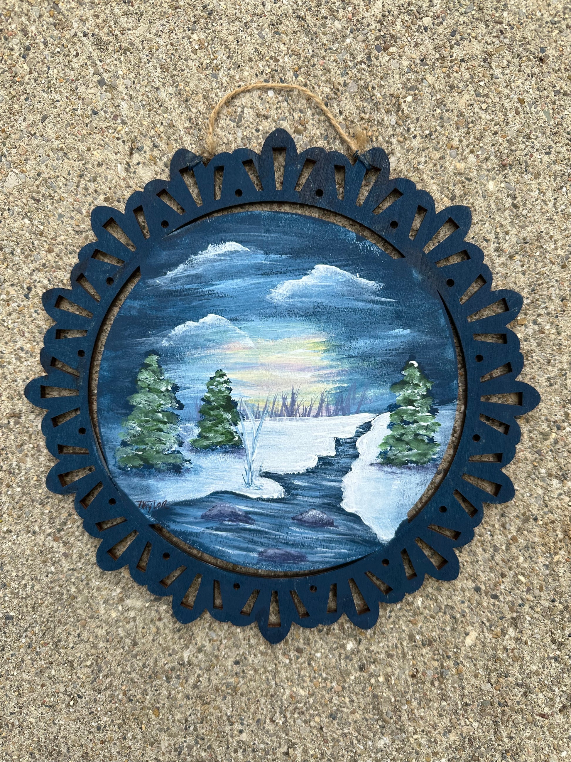 Hand painted 8” round wood. Acrylic painting.